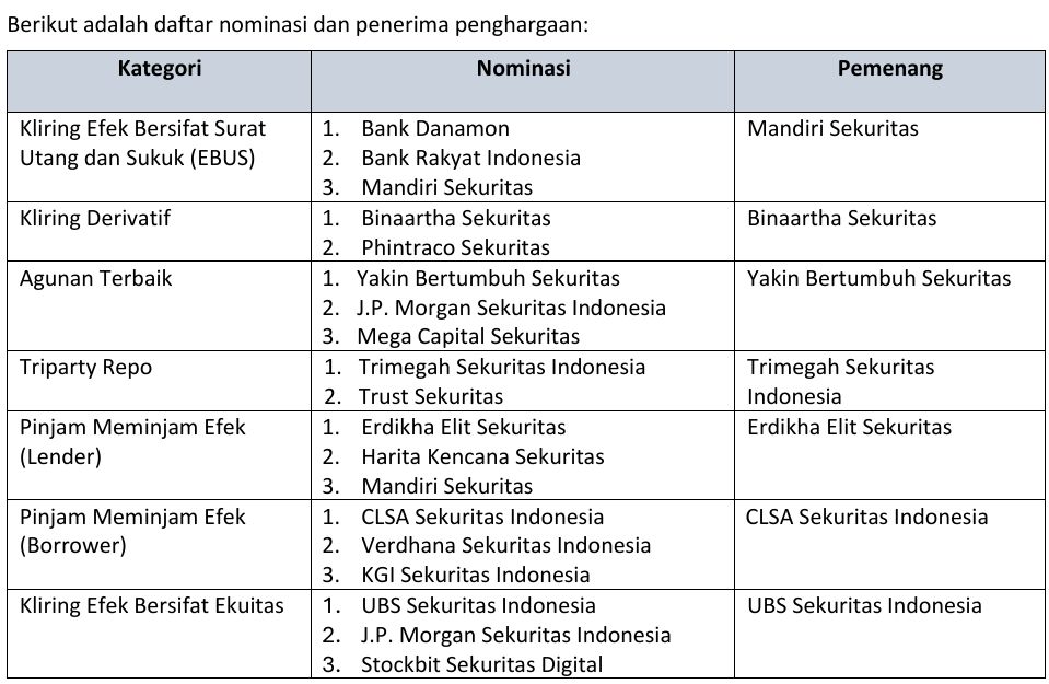 Penghargaan diberikan dalam berbagai kategori sesuai layanan utama KPEI dalam menunjang kinerja pasar modal Indonesia.