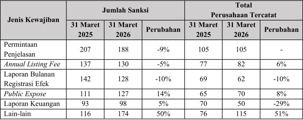 Berdasarkan data sanksi per 31 Maret 2026, BEI mencatat adanya peningkatan jumlah sanksi pada beberapa jenis kewajiban.