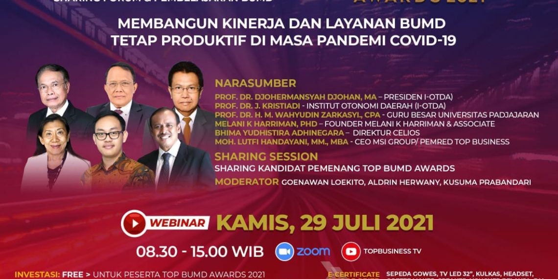 Jakarta, TopBusiness – Majalah TopBusiness hari ini (Kamis, 29/7/2021) menyelenggarakan Webinar dengan tema “Membangun Kinerja dan Layanan BUMD Tetap Produktif di Masa Pandemi Covid-19”. Webinar yang dihadiri sekitar 300 peserta ini merupakan rangkaian kegiatan TOP BUMD Awards 2021 yang puncak acaranya bakal digelar pada 19 Agustus 2021.
