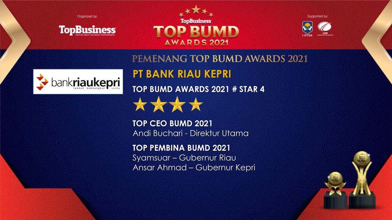 Jakarta, TopBusiness – PT Bank Pembangunan Daerah Riau Kepri (Bank Riau Kepri) menjadi pemenang dalam ajang bergengsi TOP BUMD Awards 2021. Perseroan berhasil mendapatkan tiga penghargaan, yaitu TOP BUMD Awards 2021 # Star 4, diikuti TOP PEMBINA BUMD 2021 kepada Gubernur Riau, Syamsuar, dan Gubernur Kepri, Ansar Ahmad, serta TOP CEO BUMD 2021 untuk Direktur Utama, Andi Buchari.