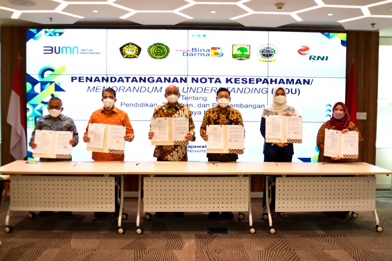 Kerja sama yang bertujuan untuk memperkuat link and match tersebut, ditandatangani oleh Direktur Utama RNI Arief Prasetyo Adi, bersama Rektor Universitas Pancasila Prof. Dr. Edie Toet Hendratno, S.H., M.Si., Rektor Universitas Andalas Prof. Dr. Yuliandri, S.H., M.H., Rektor Universitas Bina Darma Dr. Sunda Ariana, M.Pd. M.M., Rektor Institut Sains dan Teknologi Al-Kamal Dr. Dede Rukmayadi, S.T., M.Si., dan Rektor Universitas Muhammadiyah Palembang Dr. Abid Djazuli, S.E., M.M., yang diwakili oleh Direktur Pasca Sarjana Dr. Sri Rahayu, serta disaksikan Komisaris Independen RNI Prof. Dr. Ir. Marsudi Wahyu Kisworo.