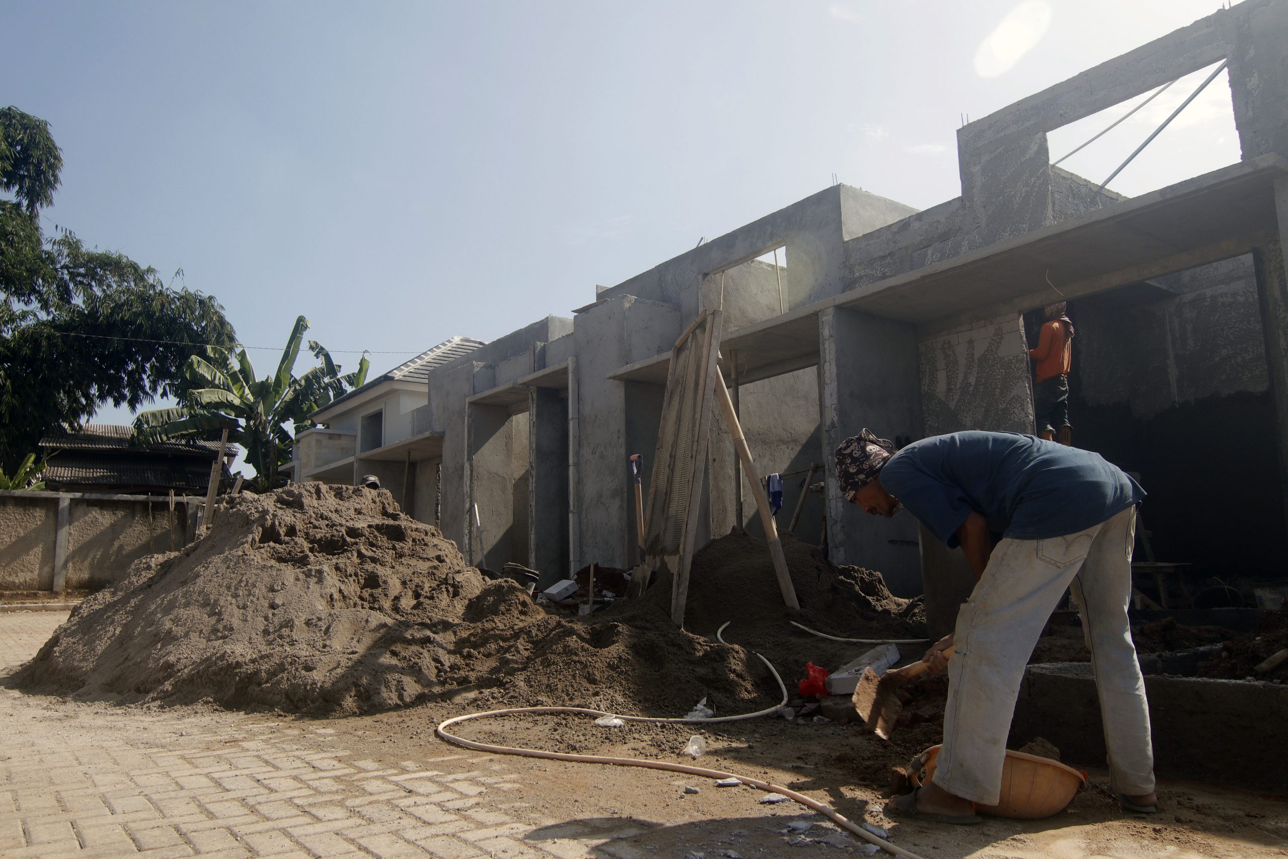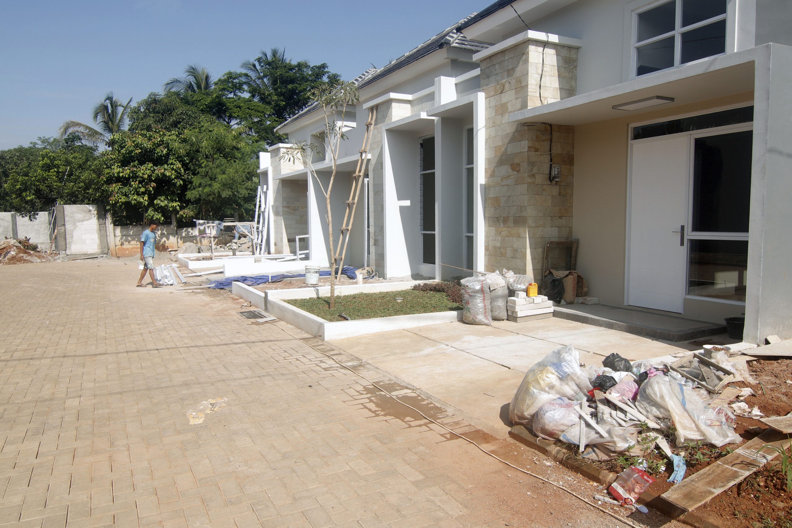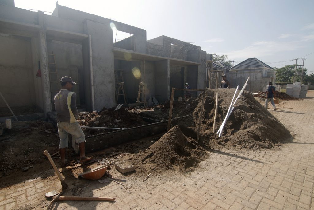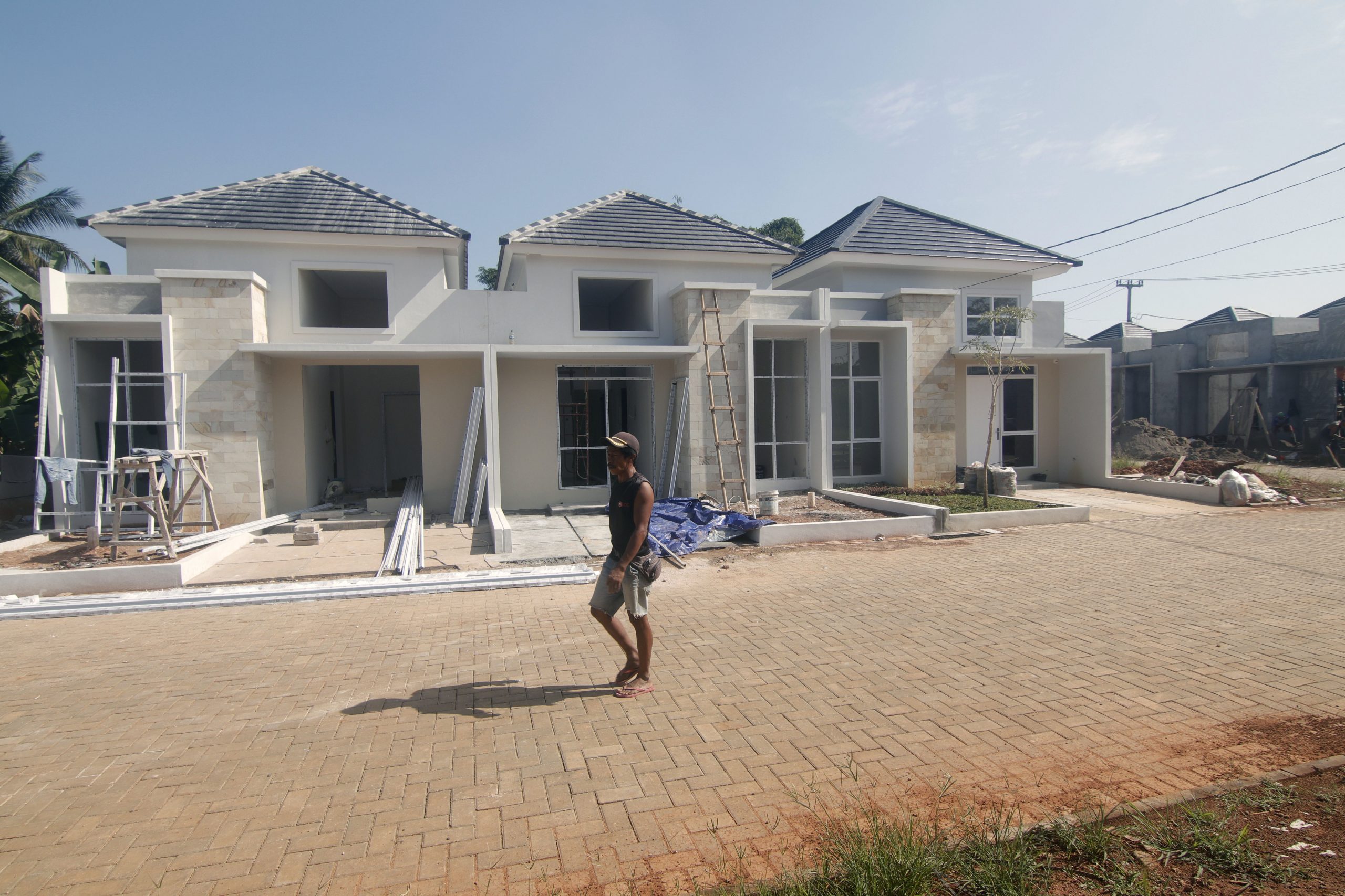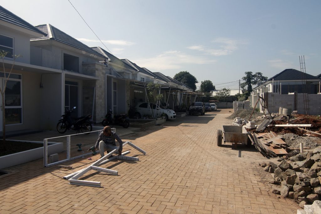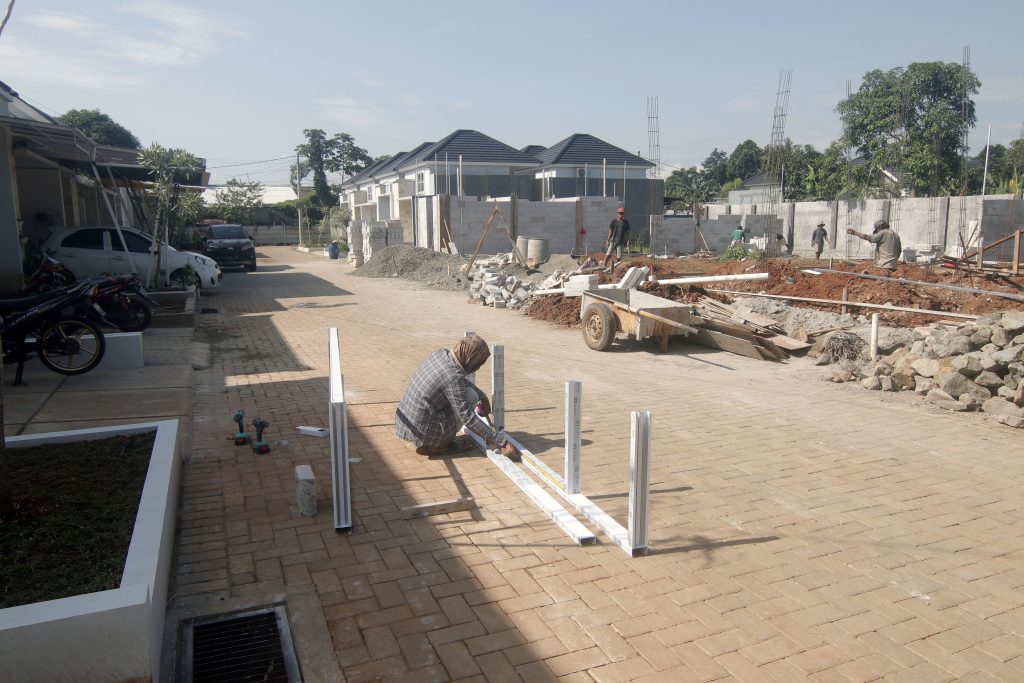 Pekerja tampak menyelesaikan progres pembangunan perumahan di Kawasan Parung, Bogor, Rabu (16/2/2022).