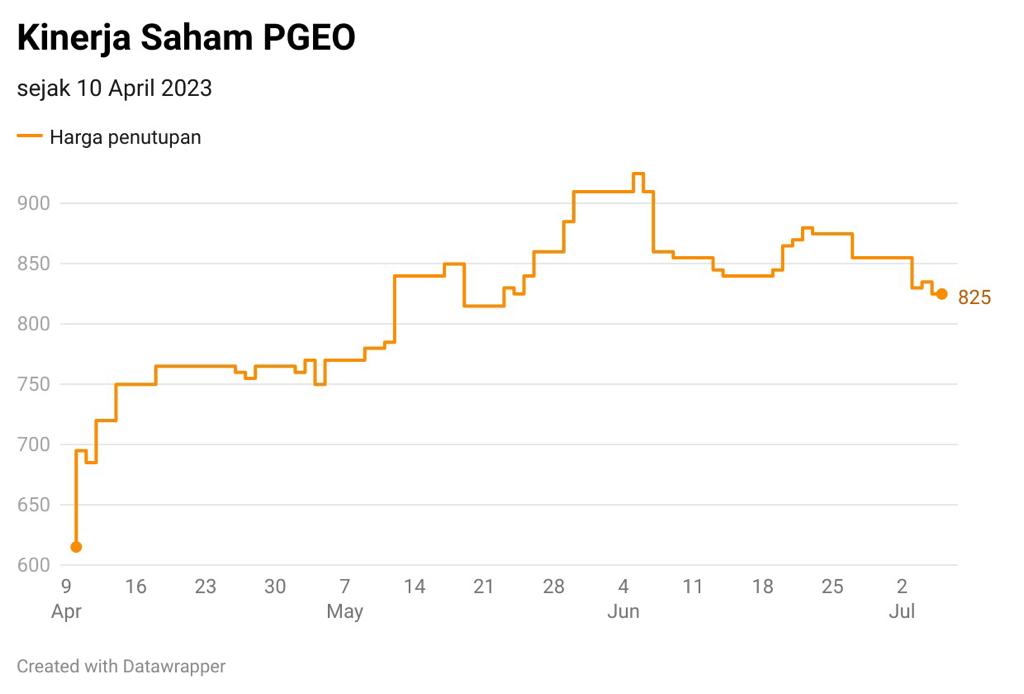 Sejak menyentuh level terendah 10 April lalu di harga Rp615, saham PGEO perlahan mulai pulih dan ditutup di Rp825/saham pada perdagangan Kamis (6/7). Artinya dalam kurun waktu kurang dari dua bulan, PGEO mencatatkan kenaikan hingga 34%.