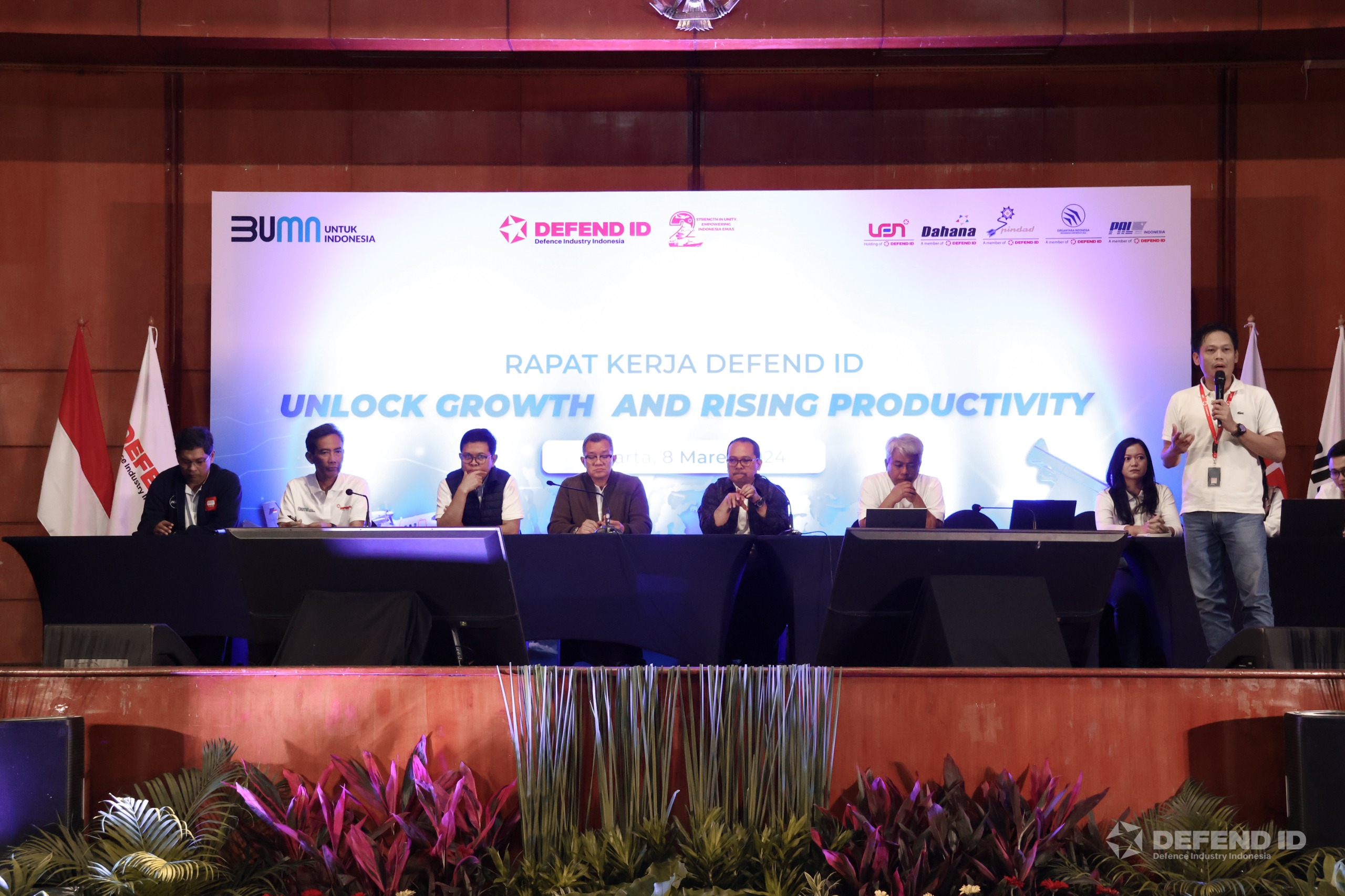 Raker holding DEFEND ID 2024 dihadiri secara fisik oleh Asisten Deputi Bidang Industri Manufaktur Kementerian BUMN Chairiah, Direktur Utama PT Len Industri (Persero) Holding DEFEND ID Bobby Rasyidin, jajaran Direksi PT Len Industri (Persero) holding DEFEND ID, Direktur Utama dan jajaran Direksi anggota holding DEFEND ID, serta struktural terkait dari tiap perusahaan.